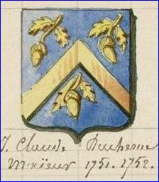 (2019) D'azur au chevron d'argent chargé d'une fleur de lis au pied nourri de gueules en chef et de deux étoiles du même en flancs, accompagné en chef de deux glands feuillés de deux pièces d'or et en pointe d'une tête de loup arrachée d'argent et lampassée de gueules.