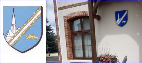 D'azur à la barre diminuée d'argent côtoyée de deux jumelles en barre d'or, potencées et contre potencées dans l'intervalle, accompagnées, à dextre d'une église d'argent mouvant de la jumelle et à senestre d'un lion léopardé d'or.
