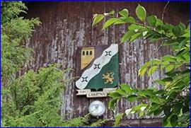 Taillé: au 1er de pourpre à l'église du lieu d'or, ajourée de sable, mouvant de la partition, au 2e de sinople au lion d'or, armé et lampassé de gueules; à la barre ondée d'argent chargée de trois fers de moulin de sable, brochant sur la partition.
