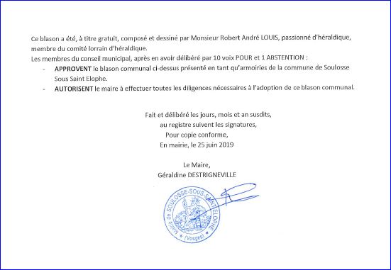(2019) Coupé: au 1er de gueules à la croix pattée alésée arrondie concave d'or, supportant deux colombes d'argent, allumées, becquées et membrées d'or, posées de trois quart sur les branches horizontales et accostée de deux glaives romains [gladius] d'argent garnis d'or celui de dextre posé en bande celui de senestre en barre, au 2e d'azur, chargé, à dextre, d’un bouquet de quatre épis d’or liés de gueules et, à senestre, d'une roue de moulin d'or.