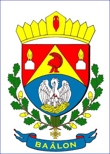 (2019) Coupé voûté: au 1er d'or au casque de centurion romain de gueules et chapé de gueules chargé de deux cierges d'argent enflammés d'or, au 2e d'azur au pélican d'argent avec sa piété de gueules sur son aire d'or.