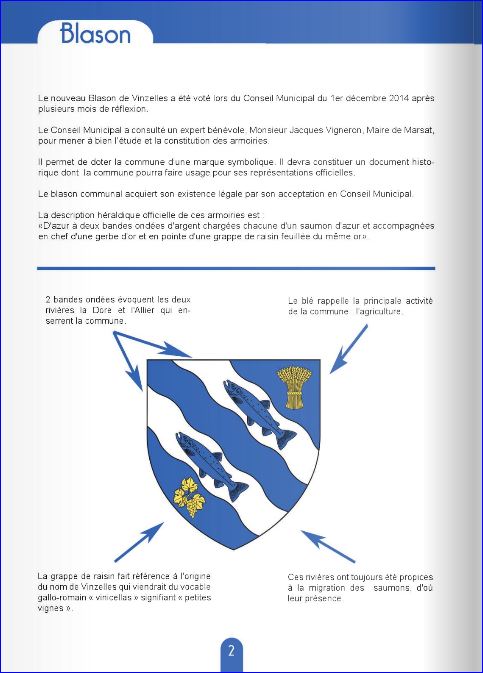 (2014) D'azur à deux bandes ondées d'argent, chargées chacune d'un saumon du champ et accompagnées en chef d'une gerbe de blé d'or et en pointe d'une grappe de raisin feuillée du même.