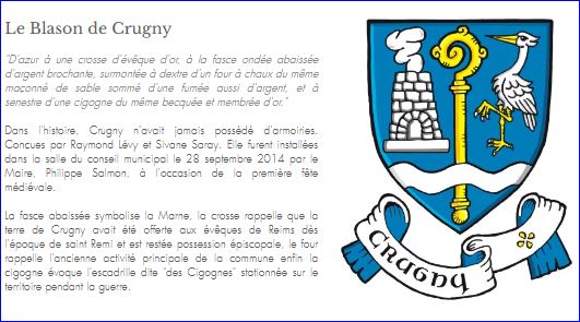 (2014) D'azur à la crosse d'or adextrée d'un four à chaux d'argent, maçonné de sable et d'où s'échappe une fumée d'argent et senestrée d'une cigogne d'argent, becquée et membrée d'or, à la burelle ondée d'argent brochant en pointe sur le fût de la crosse.