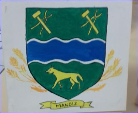 De sinople à la fasce ondée d'azur bordée en filet d'argent, accompagnée en chef de deux masses et de deux pinces d'or, passés deux à deux en sautoir et en pointe d'un loup courant du même.