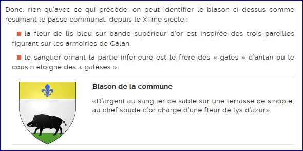 D'argent au sanglier de sable sur une terrasse de sinople; au chef d'or chargé d'une fleur de lis d'azur.
