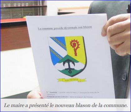 (2019) Tiercé en pairle renversé: au 1er d'azur à la bande d'argent côtoyée de deux jumelles potencées imbriquées intérieurement d'or, au 2e d'or au crosseron de gueules, au 3e de sinople à la fasce ondée d'argent et à l'ancre de marine de sable renversée et brochante.