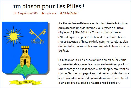 (2019) D'azur à la tour d'or, maçonnée, ouverte et ajourée de sable, posée sur une montagne de sept copeaux cousue de sinople mouvant de la pointe, accompagnée en chef à dextre d'un soleil non figuré d'or et à senestre de deux clés passées en sautoir, les anneaux liés par un lacs, du même.