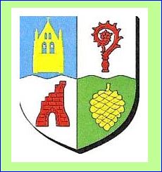 (2018) Écartelé, le trait du coupé ondé: au 1er d'azur au clocher d'or, ajouré du champ et campané de deux pièces d'argent, au 2e d'argent au crosseron de gueules, au 3e d'argent à la tour ruinée de gueules, ouverte du champ et maçonnée de sable, au 4e de sinople à la pomme de pin d'or, le pédoncule en haut.