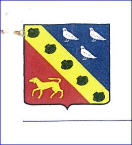 Tranché: au 1er d'azur à trois colombes d'argent, au 2e de gueules au chien passant d'or; à la bande du même chargée de cinq coquilles de sable brochant sur la partition.