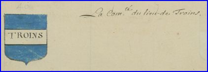 D'azur à la fasce d'argent chargée de l'inscription « TROINS » de sable.