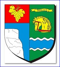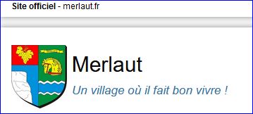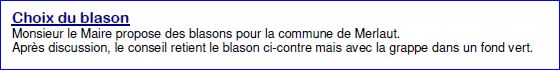(2018) Parti: au 1er d'azur à la falaise d'argent mouvant du flanc dextre et de la pointe, au chef cousu de gueules chargé d'une grappe de raisin tigée et feuillée d'or, au 2e de sinople à la tête coupée de cheval d'or bridée de gueules, surmontée d'une banderole d'or chargée de l'inscription « MERLAUT » de sable et soutenue d'une fasce ondée d'azur bordée d'or.