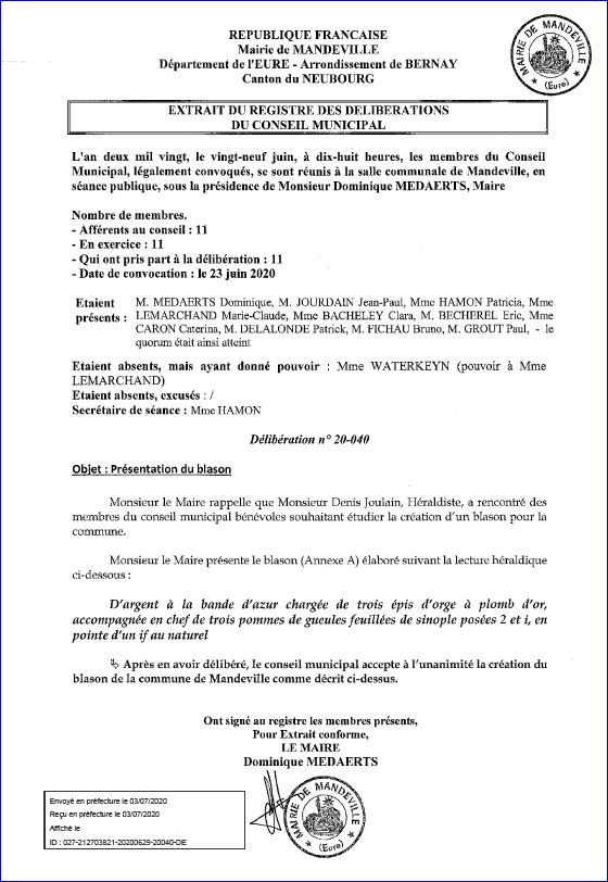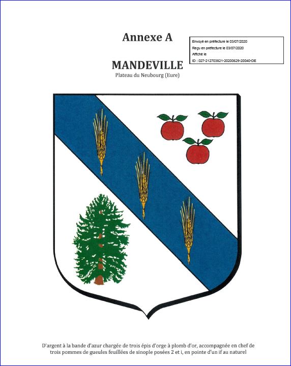 (2020) D'argent à la bande d'azur chargée de trois épis d'orge d'or posés à plomb, accompagnée en chef de trois pommes de gueules feuillées de sinople, 2 et 1, et en pointe d'un if au naturel.