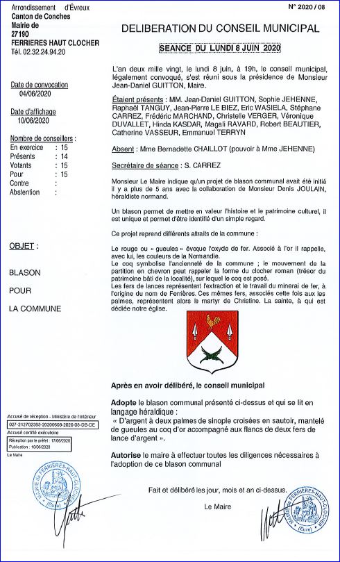 Extrait du Registre des Délibérations du Conseil Municipal du 8 juin 2020.