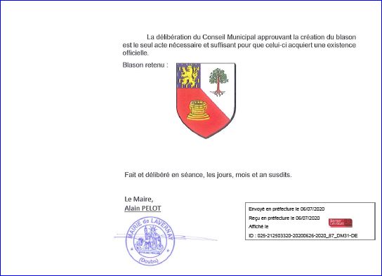 (2020) Tranché: au 1er d'argent à l'aulne au naturel, au 2e de gueules au puits d'or maçonné de sable; au franc-canton d'azur semé de billettes d'or, au lion couronné du même armé et lampassé de gueules.