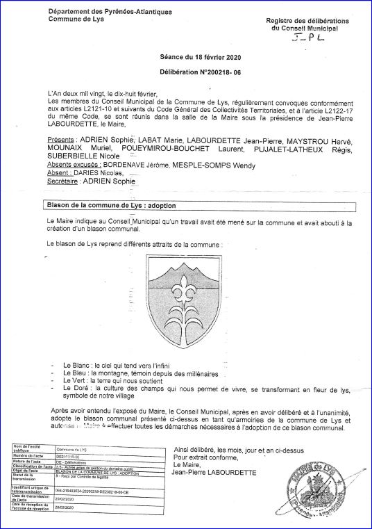 (2020) De sinople au chef d'argent chargé d'une montagne de trois pics d'azur; à la tige d'or feuillée de quatre pièces opposées deux à deux, sommée d'une fleur de lis, le tout d'or et mouvant de la pointe.