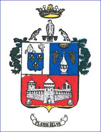Coupé: au 1er parti au I d'argent à l'écusson d'azur à trois fleurs de lis d'or, timbré à dextre d'une mitre du champ et brochant à senestre sur une crosse du même, au II d'azur à la carafe d'argent au bandeau de sable chargé d'une grappe de raisin et d'une feuille de vigne d'argent, accostée de deux grappes de raisin tigées d'or et surmontée d'un soleil du même mouvant du chef, au 2e de gueules au château-fort de trois tours couvertes et girouettées, d'argent maçonné de sable, accompagné en pointe de deux coquilles d'argent et à la plaine ondée d'or.