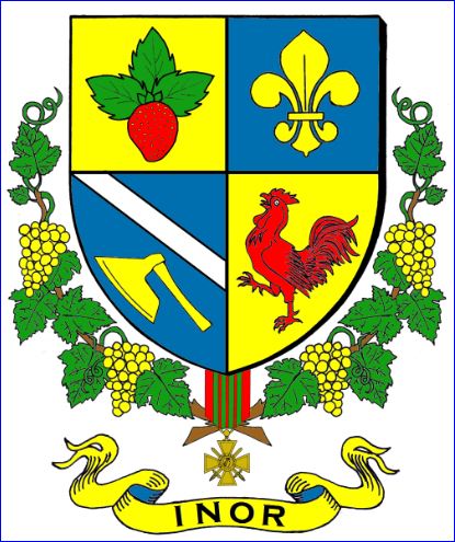 (2020) Écartelé: au 1er d'or à la fraise de gueules aux akènes d'or et feuillée de sinople, au 2e d'azur à la fleur de lis d'or, au 3e d'azur, à la cotice haussée d'argent accompagnée en pointe d'une doloire d'or, au 4e d'or, à un coq hardi et chantant de gueules, allumé d'argent.
