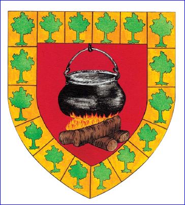 De gueules au chaudron de sable appendu à un crochet du même mouvant du chef et posé sur des bûches de tenné enflammées d'or; à la bordure componée de seize pièces toutes d'or et chargée chacune d'un arbre de sinople posé à plomb.