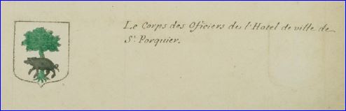 D'argent au chêne terrassé de sinople, à la laie accompagnée de deux marcassins, de sable, contournés et brochant sur le tout.