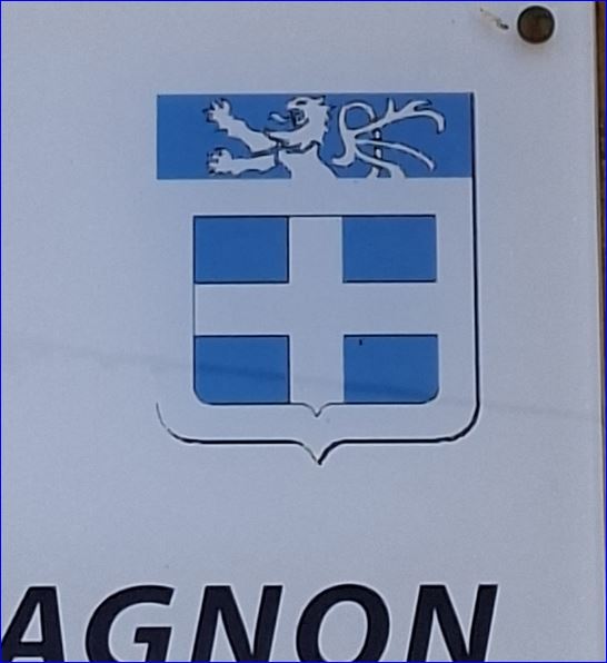 D'azur à la croix d'argent; à la bordure du même; au chef d'azur chargé d'un lion issant d'argent.