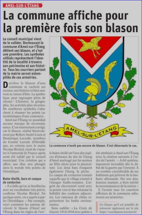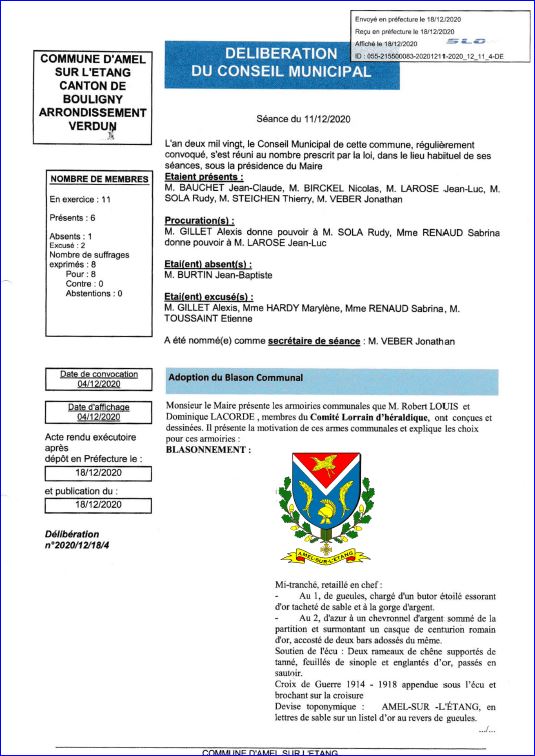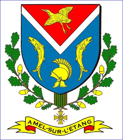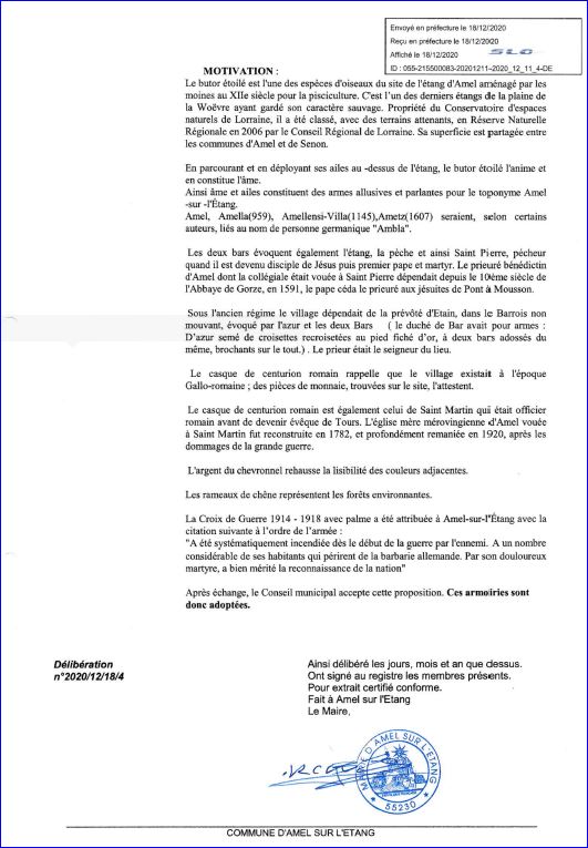(2020) Mi-tranché et retaillé en chef: au 1er de gueules au butor étoilé essorant d'or, tacheté de sable et la gorge d'argent, au 2e d'azur au casque de centurion romain d'or accosté de deux bars adossés du même; au chevronnel renversé d'argent brochant sur la partition.