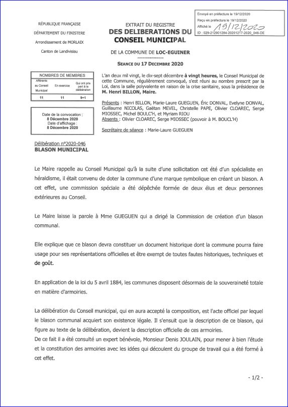 Extrait du Registre des Délibérations du 17 décembre 2020 (1/2).