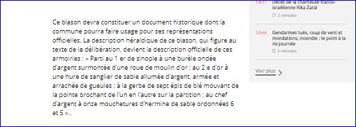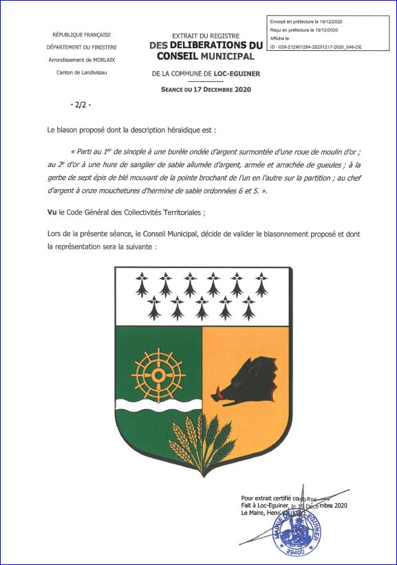 (2020) Parti: au 1er de sinople à la burelle ondée d'argent surmontée d'une roue de moulin d'or; au 2e d'or à la hure de sanglier de sable allumée d'argent, défendue et arrachée de gueules; à la gerbe de sept épis de blé mouvant de la pointe brochant de l'un en 'autre sur la partition; le tout sommé d'un chef d'argent chargé de onze mouchetures d'hermine de sable, ordonnées 6 et 5.
