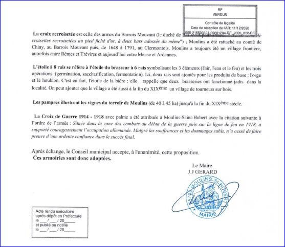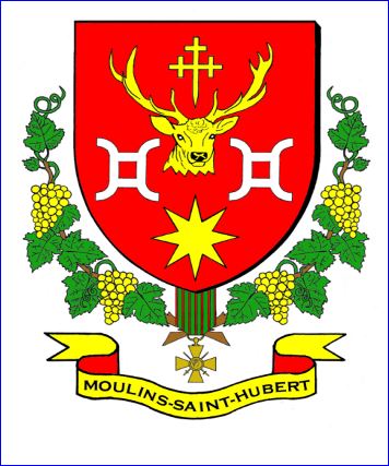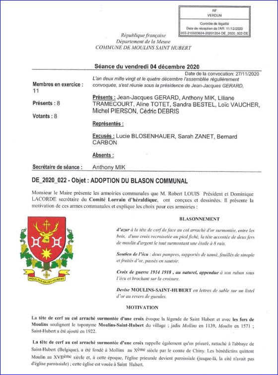 (2020) De gueules au rencontre de cerf arraché d'or surmonté entre les bois d'une croix recroisetée au pied fiché du même, accosté de deux fers de moline d'argent et accompagné en pointe d'une étoile à huit rais d'or.