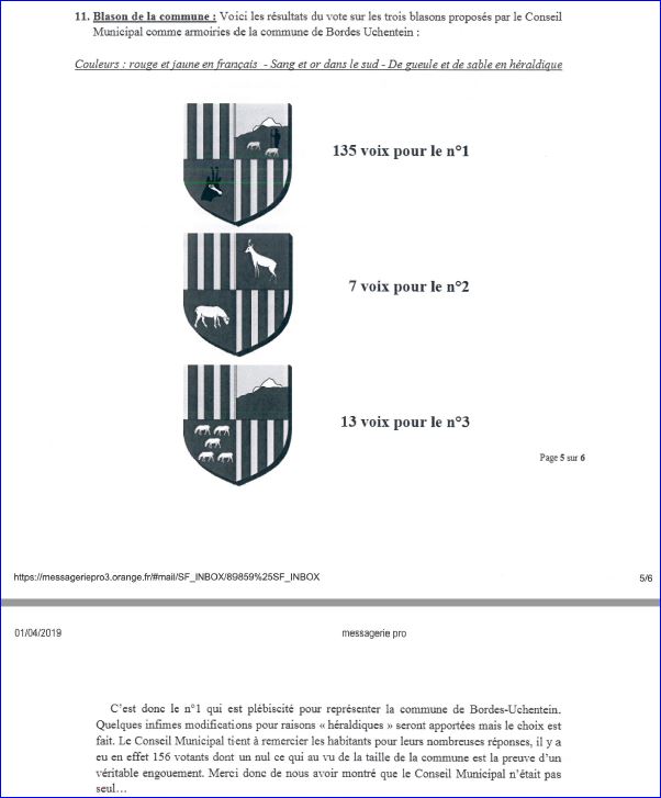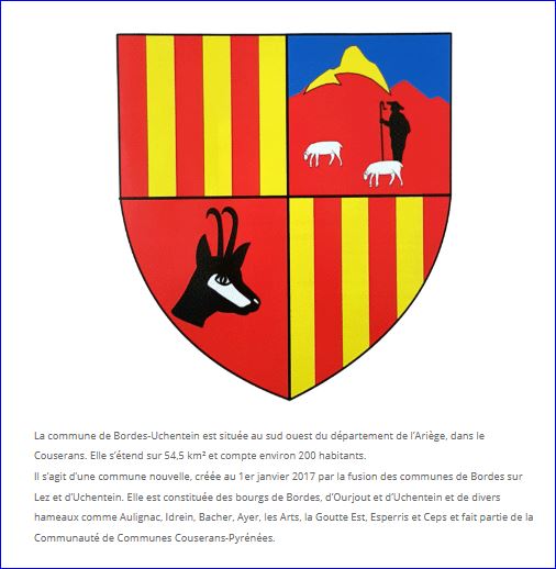 (2019) Écartelé: au 1er palé de gueules et d'or, au 2e d'azur à la montagne de gueules, le pic enneigé d'or, chargée d'un berger de sable accompagné de deux moutons paissant d'argent, au 3e de gueules à la tête d'isard coupée et contournée de sable, ombrée d'argent, au 4e palé d'or et de gueules.