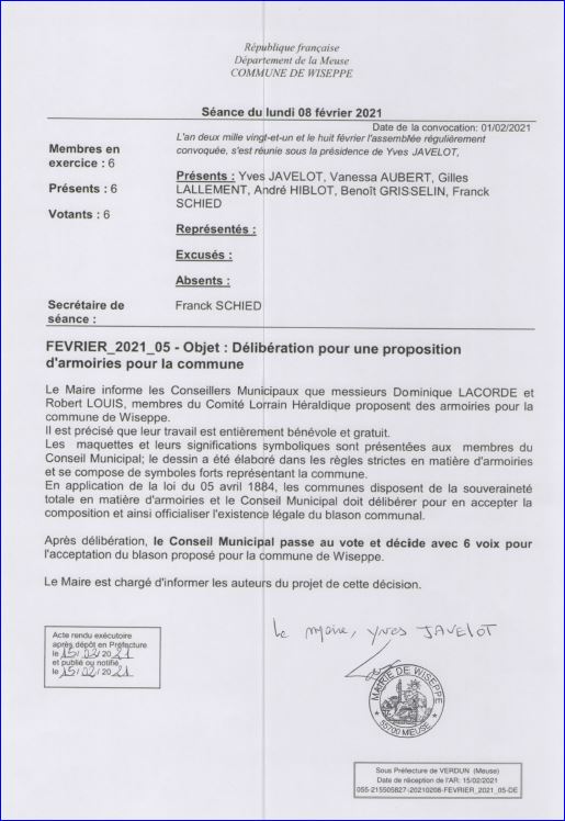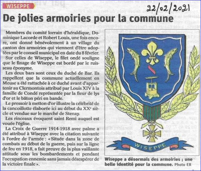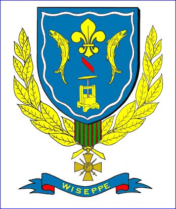 (2021) D'azur chargé à la fleur de lis d'or en chef accostée de deux bars du même adossés du même, au pressoir à metton d'or, la vis d'argent, en pointe et au bâton péri en bande de gueules en abîme; le tout enfermé dans un orle en filet ondé d'argent.