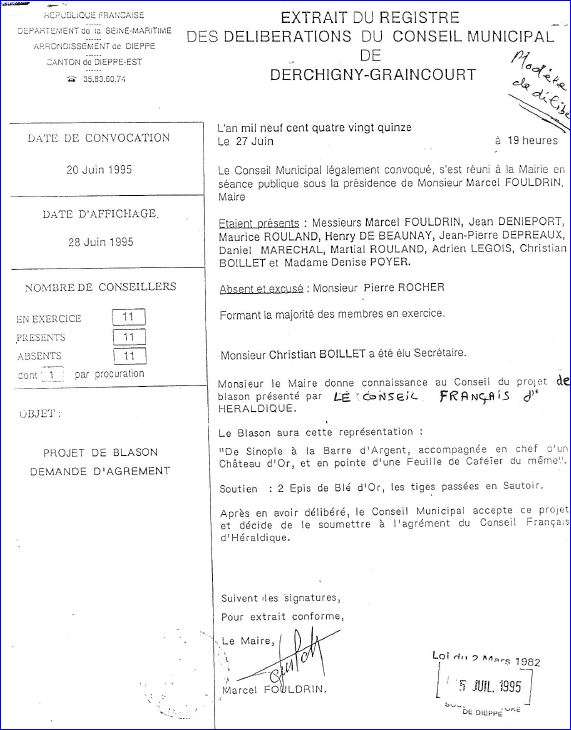 De sinople à la barre d'argent, accompagnée en chef du château du lieu d'or, et en pointe d'une feuille de caféier du même mise en barre.