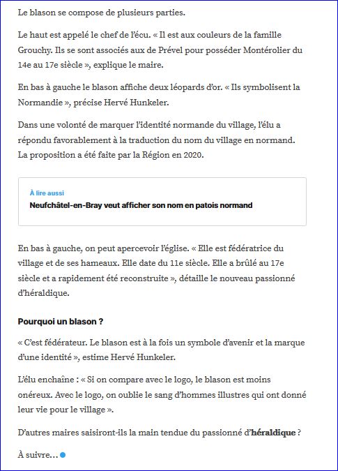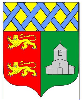 (2021) Parti: au 1er de gueules à deux léopards d'or armés et lampassés d'azur, l'un au-dessus de l'autre, au 2e de sinople à l'église au clocher campané d'argent; le tout sommé d'un chef d'or fretté d'azur.