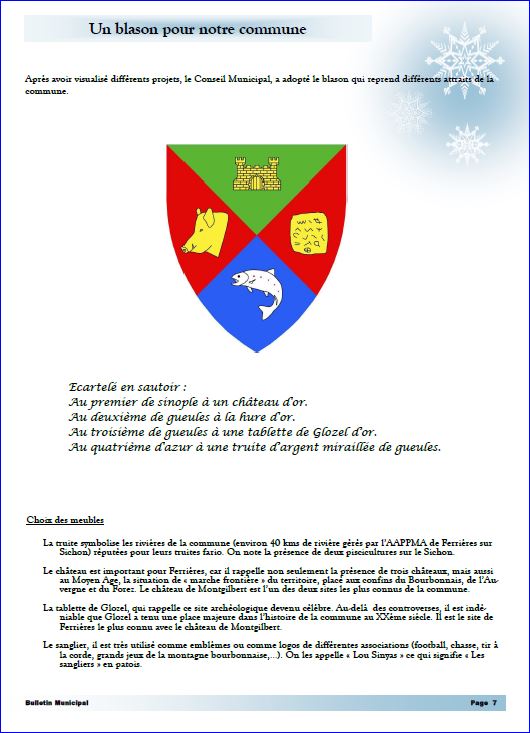 (2017) Écartelé en sautoir: au 1er de sinople au château d'or, maçonné de sable, au 2e de gueules à la hure de sanglier d'or, au 3e de gueules à la tablette de Glozel d'or, au 4e d'azur à la truite d'argent miraillée de gueules..