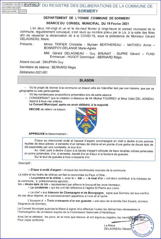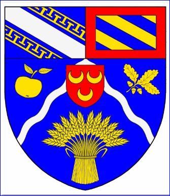 (2021) D'azur au chevronnel ondé et haussé d'argent, accompagné en chef à dextre d'une pomme feuillée de deux pièces, à senestre d'un rameau de chêne et en pointe d'une gerbe de douze épis de blé liés par une cordelette, le tout d'or; au chef parti à dextre d'azur à la bande d'argent côtoyée de deux jumelles potencées contre-potencées dans l'intervalle d'or et à senestre bandé d'or et d'azur à la bordure de gueules; sur le tout, de gueules à trois croissants d'or.