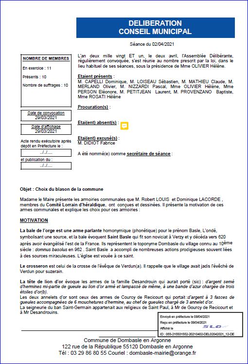 (2021) D'azur à la bande ondée de gueules, bordée d'argent, chargée d'un crosseron d'or, posé à plomb, accosté de deux annelets du même, la bande accompagnée, en chef d'une tête de lion d'or et, en pointe d'un épi d'orge du même, posé en bande.