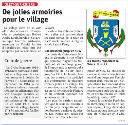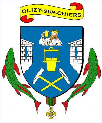 (2021) D'azur au creuset de fonderie d'or, accompagné, en chef, du buste de Gambrinus de carnation, barbé de tenné, vêtu d'argent, couronné, au collier et à l"anneau d'or, tenant un bock du même moussant d'argent, en flancs, de deux bretèches d'argent maçonnées de sable, percées chacune d'une meurtrière canonnière du champ, mouvant des flancs, et, en pointe, de deux pics de carrier d'argent emmanchés d'or, passés en sautoir.