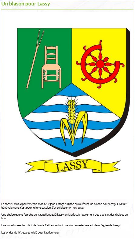(2019) Tiercé en pairle renversé: au 1er de sinople à la chaise de tenné adextrée d'une fourche du même posée en pal et penchée vers senestre, au 2e d'or à la roue de sainte Catherine de gueules rompue en chef à senestre, ai 3e d'azur à trois fasces ondée d'argent et à l'épi de blé tigé et feuillé d'or brochant sur les fasces.