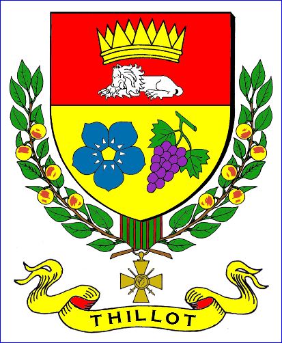 (2021) Coupé: au 1er de gueules à la couronne antique d'or surmontant un lion couché et endormi d'argent, au 2e d'or, à la quintefeuille d'azur, au bouton pentagonal du champ entouré de dix triangles d'argent à dextre, et à la grappe de raisin de pourpre, tigée et feuillée de sinople à senestre.