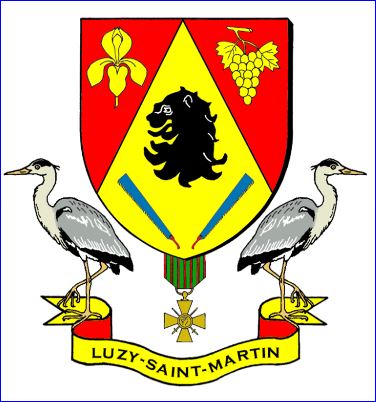 (2021) D'or à la tête de lion arrachée de sable surmontant deux scies crocodiles d'azur emmanchées de gueules posées hautes, adossées, en chevron renversé; chapé de gueules chargé à dextre d'une fleur d'iris des marais d'or et à senestre d'une grappe de raisin tigée, feuillée et fruitée du même.