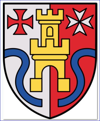 (2021) Parti d'argent et de gueules; à la tour donjonnée d'or, ouverte du champ brochant sur la partition, accompagnée, en chef, à dextre, d'une croisette pattée de gueules et, à senestre, d'une croix de Malte d'argent, et, en pointe, d'une divise d'azur mouvant à mi-flanc, ployée et nébulée d'une pièce versée et rompue en pointe.