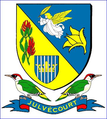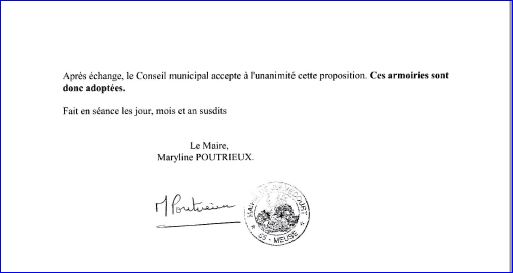 (2021) Tranché: au 1er d'azur à l'ange en vol, posé en bande, de carnation, vêtu d'argent chevelé et ailé d'or, portant une plume du même de sa main dextre, senestré d'une faîne du même, au 2e d'or à l'écusson d'azur chargé d'une couronne d'or surchargé de six vergettes d'argent brochantes, surmonté à dextre d'un brin de luzerne en pal, tigé et feuillé de sinople, fleuri de gueules.
