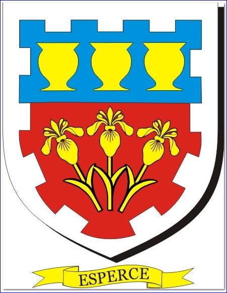 De gueules à trois iris d'or, rangés en fasce et posés, celui de dextre en bande, celui du centre en pal et celui de senestre en barre; au chef cousu d'azur chargé de trois poteries d'or; le tout enfermé dans une bordure crénelée d'argent.