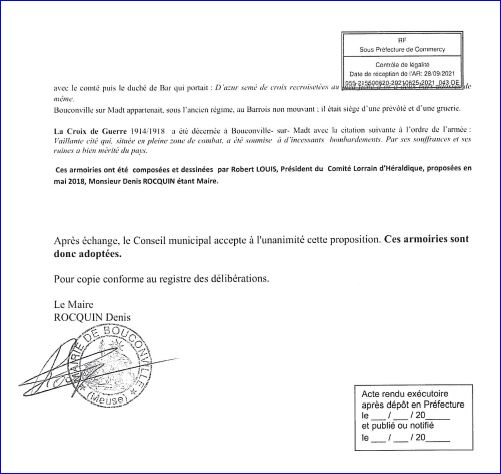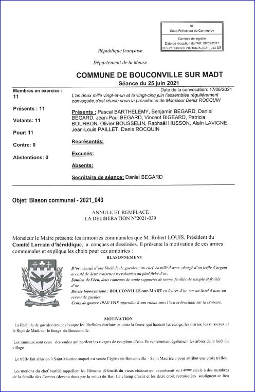 (2021) D'or à la libellule de gueules; au chef bastillé d’azur, chargé d'un trèfle d'argent accosté de deux croisettes recroisetées au pied fiché d'or.