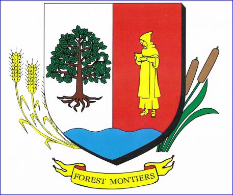 (2021) Parti: au 1er d'argent au hêtre au naturel, au 2e de gueules au moine bénédictin tenant un livre ouvert d'or; le tout sur une plaine ondée d'azur.