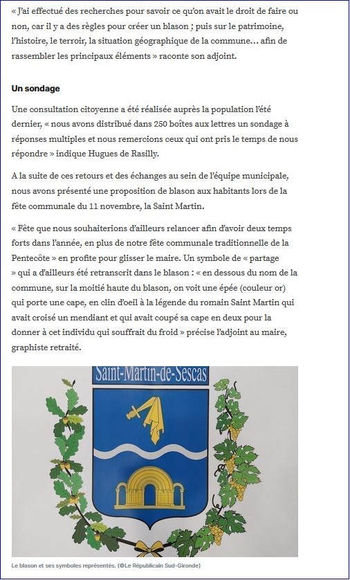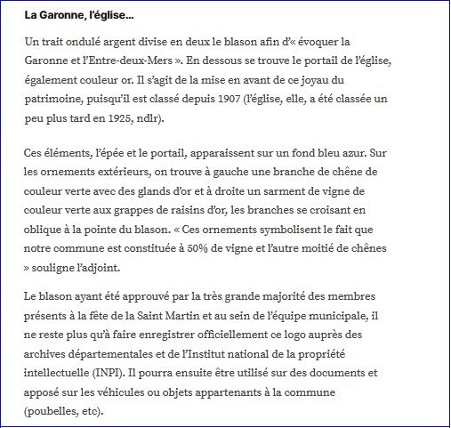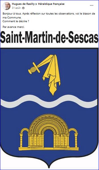 D'azur à la divise ondée d'argent accompagnée en chef d'une épée posée en barre sa pointe vers le haut à laquelle est suspendu le manteau de saint Martin, le tout d'or, et en pointe du portail stylisé de l'église du lieu de même ouvert et ajouré du champ.