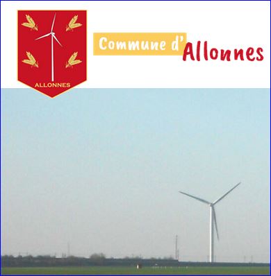 De gueules à l'éolienne sur son mât d'argent, cantonnée de huit épis de blés tigés et feuillés d'or, empoignés deux à deux et posés en bande à dextre et en barre à senestre, et soutenue de l'inscription « ALLONNES » en lettres capitales du même.