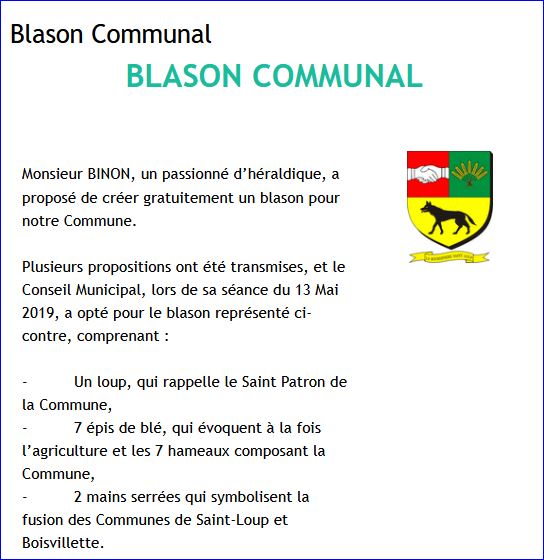(2019) Coupé: au 1er parti au I de gueules à la foi d'argent, au II de sinople à sept épis de blés d'or empoignés en éventail et liés de gueules, au 2e d'or au loup courant de sable, allumé d'argent et langué de gueules.