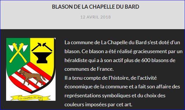 (2018) Tiercé en pairle renversé: au 1er de sinople à deux haches de bûcheron d'argent, emmanchées d'or et passées en sautoir, au 2e d'or à l'enclume de sable surmontée de deux marteaux du même, celui de dextre posé en barre et celui de senestre en bande, les tables tournées vers l'enclume, au 3e de gueules à trois bandes d'argent et au loup marchant de tenné, langué de gueules, allumé d'argent et brochant sur les bandes.
