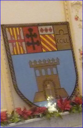 D'azur à la tour d'or ajourée de quatre pièces du champ; au chef parti de trois, au 1er écartelé en sautoir aux I et IV d'or à quatre pals de gueules et aux II et III d'argent à la croix de gueules, au 2e de gueules à la croix patriarcale tréflée de sable, au 3e d'or à quatre bandes de gueules et au chef d'argent chargé de trois fleurs de quatre pétales de gueules, au 4e de sinople à la lettre capitale oméga de sable en chef et à l'inscription « COLL » du même en pointe.