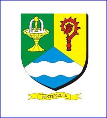 Tiercé en pairle renversé: au 1er de sinople à la fontaine d'or jaillissant de deux jets d'eau d'argent, au 2e d'or au crosseron de gueules, au 3er d'azur à la fasce ondée d'argent.